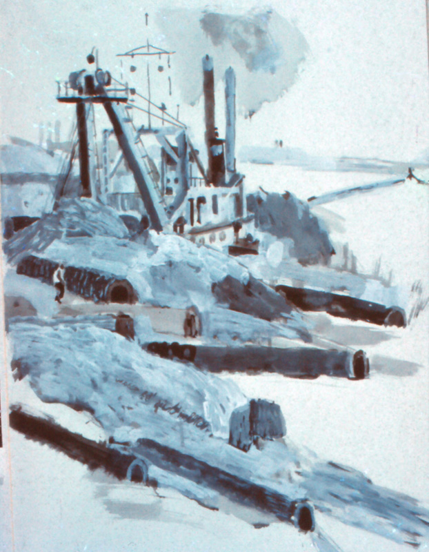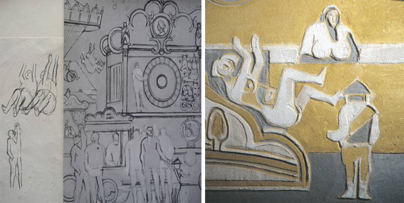 Opdracht Ahrend N.V. Rotterdam; wandschildering in tempera “De bouwput”, videwand 4.00 m x 7.00 m en Expositie van studies en ontwerpen. |
